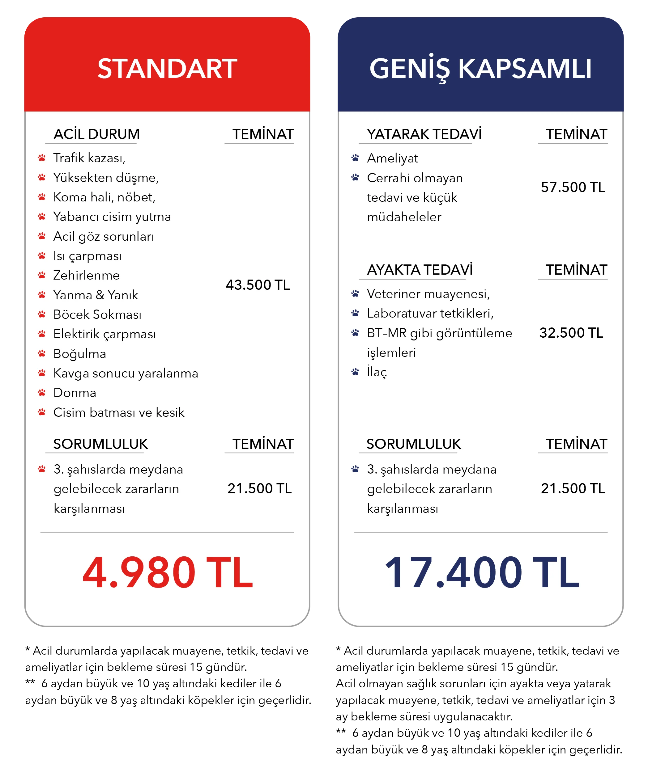 Standart Paket, evcil hayvanlarınızı acil durumlara karşı güvence altına almaktadır. Geniş Kapsamlı Paket, evcil hayvanınızı acil durumlara ek olarak birçok hastalığa karşı koruma altına almaktadır.